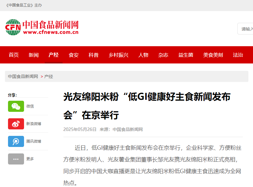 轉載中國食品新聞網(wǎng)——光友綿陽米粉“低GI健康好主食新聞發(fā)布會”在京舉行